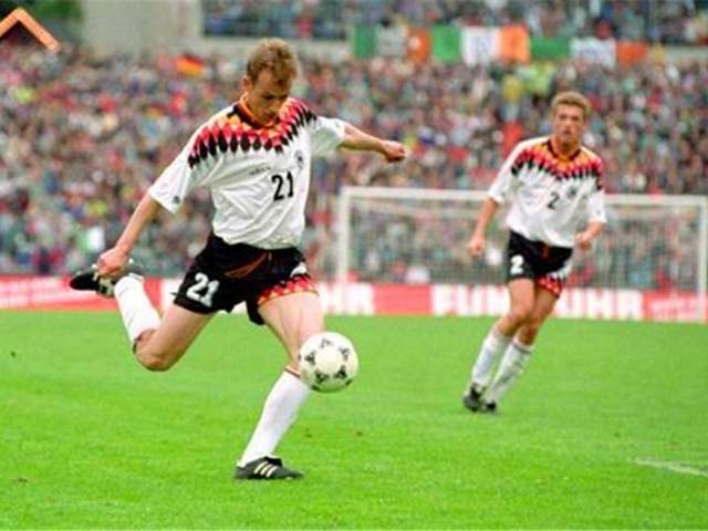合作了两个赛季,红白艾森彻底绝望,赶紧把他送到了当时还是德乙球队的柏林赫塔。在这里,巴斯勒的暴力美学彻底绽放。他的大力远射,简直就是球队的破门密码,管你什么人墙,一脚下去,球进了,墙倒了。1992—93赛季,一个踢中场的球员,居然刷出了两位数的联赛进球。